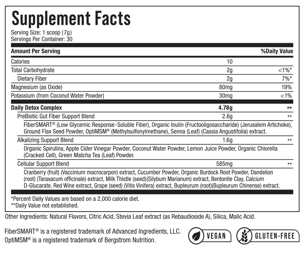 Introducing DAILY DETOX by NU-TEK Nutrition®. This comprehensive, powdered formula contains three key blends: a Prebiotic Gut Fiber Support Blend, an Alkalizing Blend, and a Cellular Detox Support Blend. With hand-selected selected ingredients like FiberSmart®, Ground Flax Seed, Cranberry, Apple Cider Vinegar, Lemon Juice, Milk Thistle and Green Matcha Tea, this easy-to-mix powder can become a new weapon in your daily health and wellness arsenal to help you feel invigorated, renewed, and refreshed.